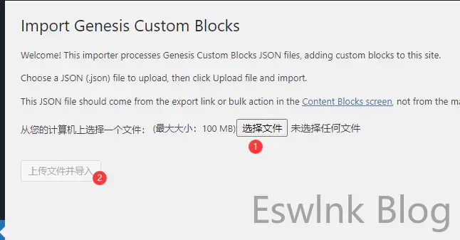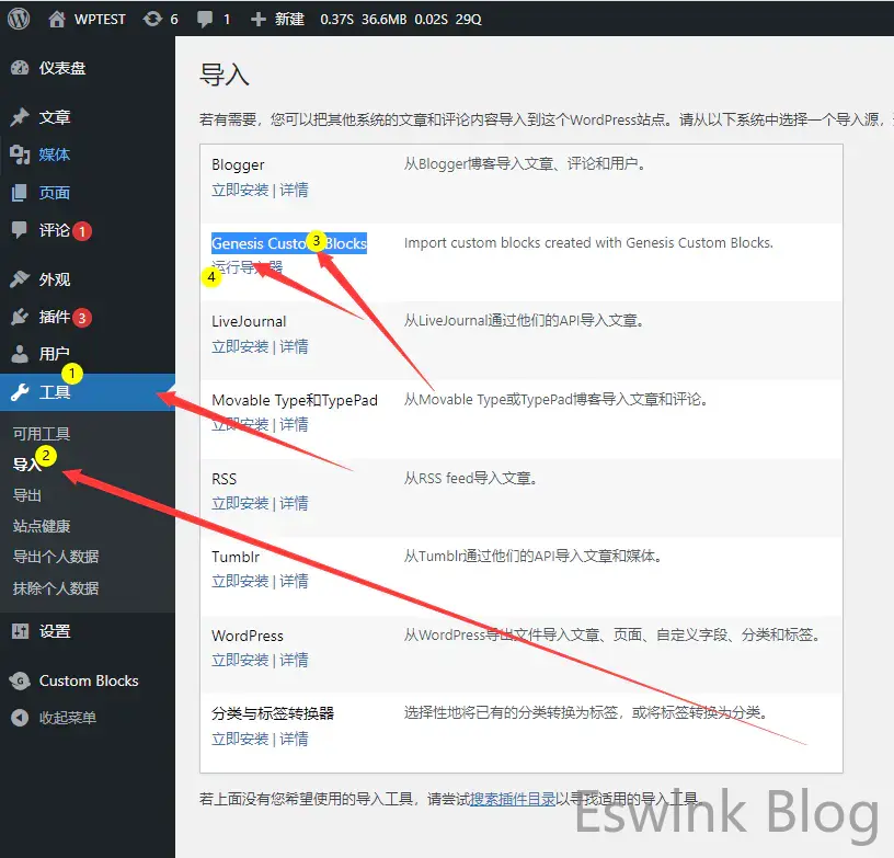 将导出的区块配置文件,导入wordpress中。点击「工具」 ->「导入」 ->「Genesis custom Blocks」->「运行导入器]」