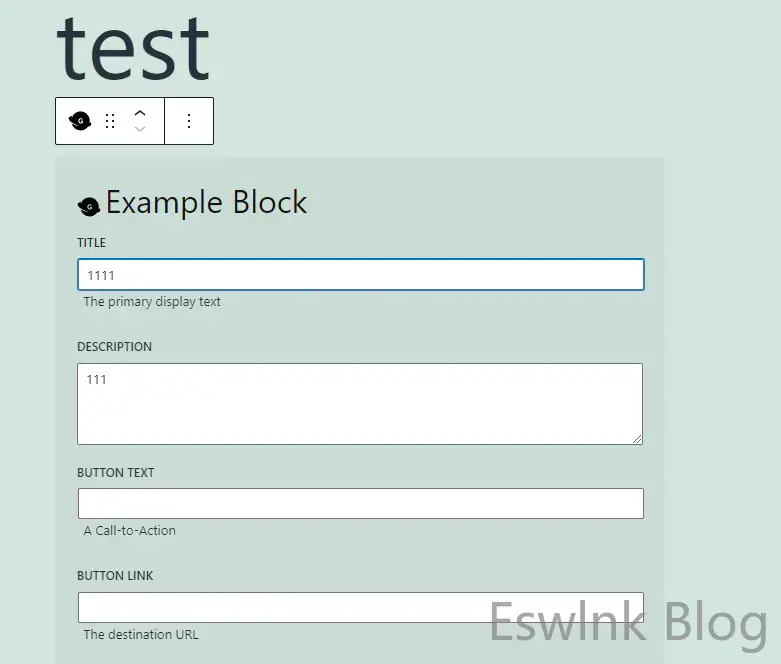 发布这个区块后,我们在文章或者页面就能看到他。我们新建一个文章或者页面,在工具栏中选择「example block」 ,例如下面所展示的: