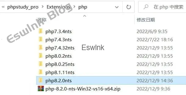将下载的文件php-8.2.0-nts-Win32-vs16-x64.zip,移到PhpStudy的php目录,大概地址是:D:\phpstudy_pro\Extensions\php