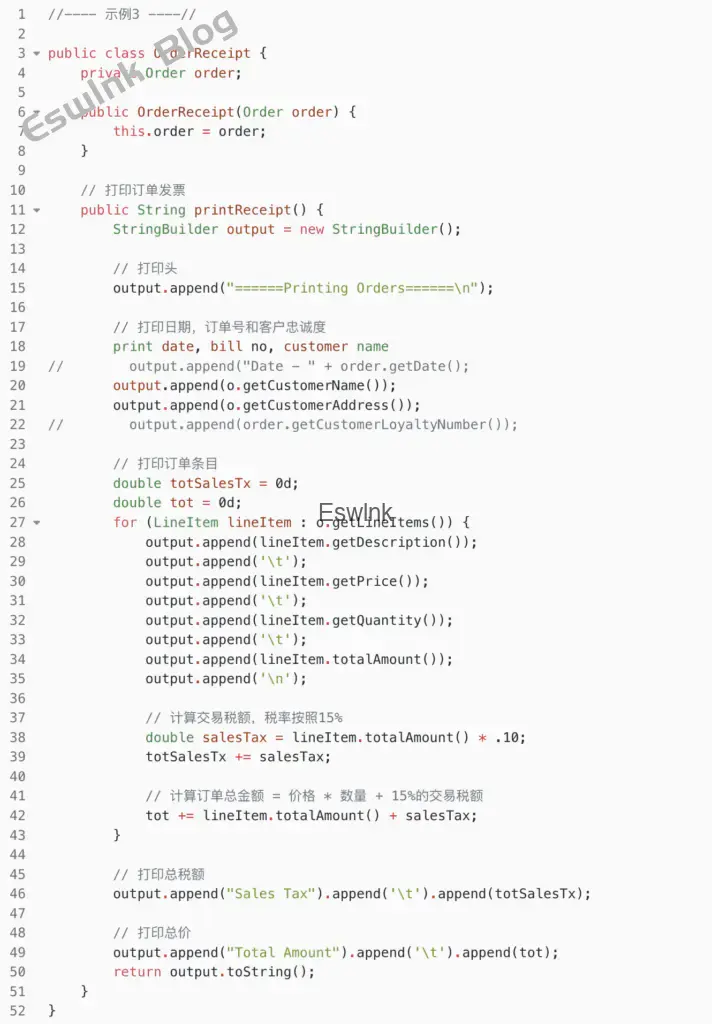 - 示例3:printReceipt方法内那个税率写的是15%,而实际用的10%,误导读者。
