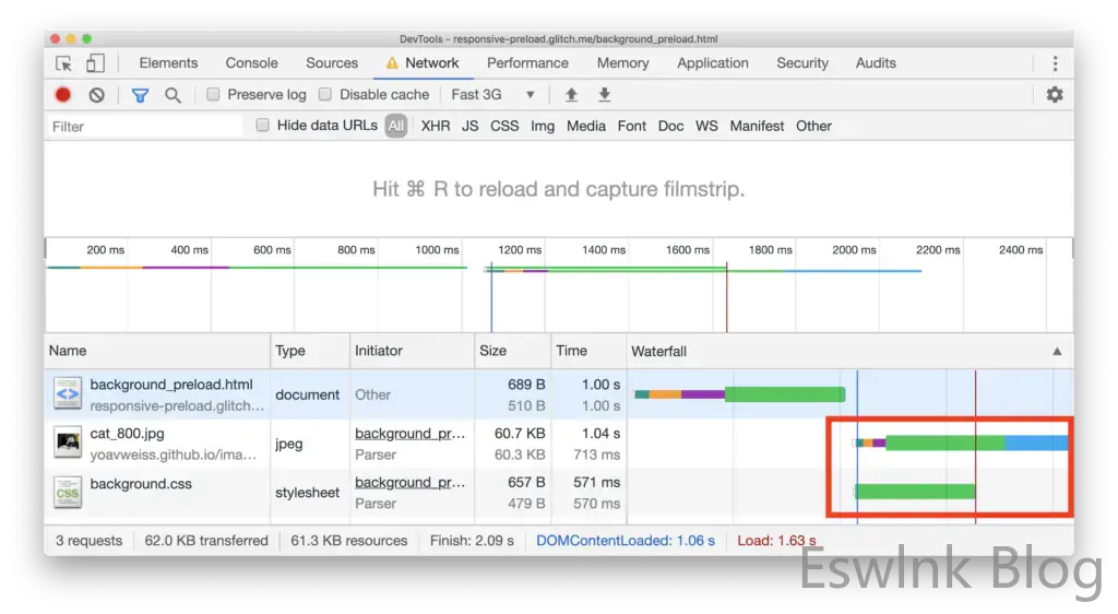 在这里,图像和CSS同时开始下载,避免了延迟,从而加快了图像的加载速度。
