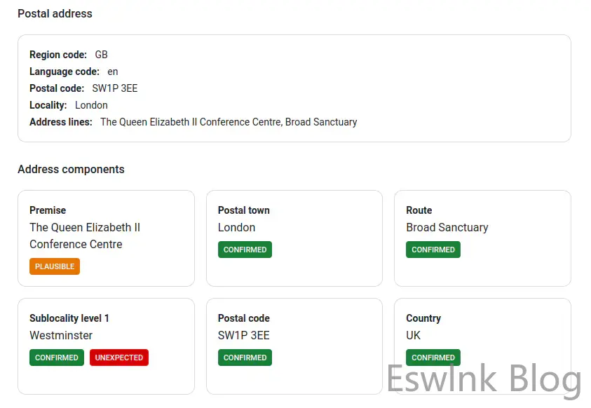 演示可用于测试功能并将 ValidateAddress 方法的响应显示为可视化内容和 JSON 对象。例如,测试即将举行的QCon London会议的未格式化地址: