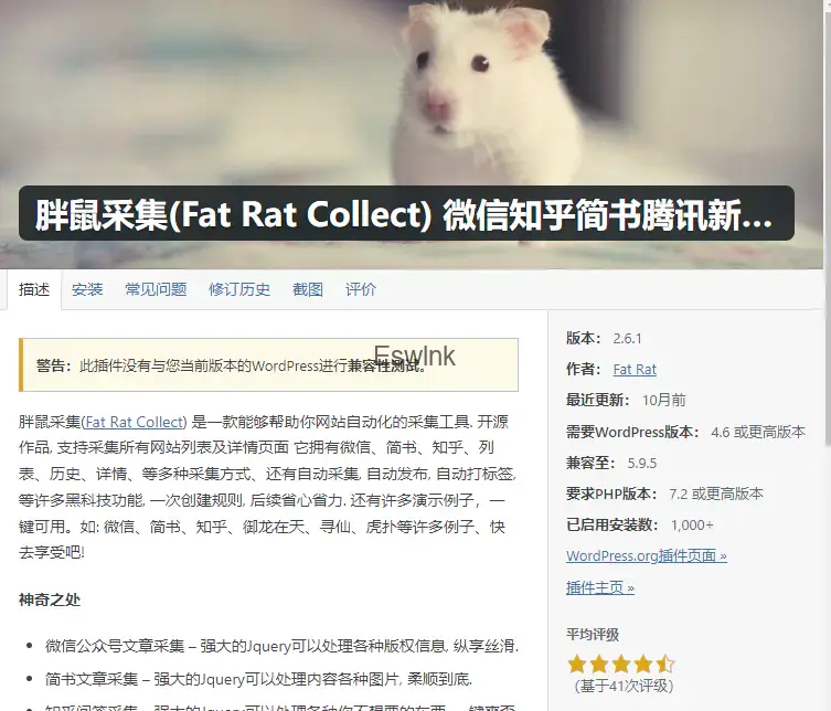 今天想要采集点想要的东西,就在WordPress后台找了找有没有好用的插件。在一番查找后,找到了个「胖鼠采集」的插件,看了下感觉还不错哈,很多人都给的好评。