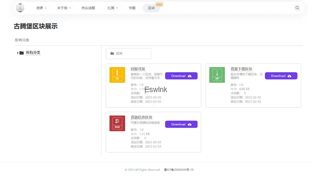 近期计划创建一个专门用于展示和下载古腾堡区块的页面。原本打算参考国外网站设计,但最终通过谷歌找到了一个适合的插件并进行了本地化处理,成功实现了下载功能,同时集成了自动文件版本管理和用户权限控制等实用特性。页面效果简洁实用,访问链接为:[古腾堡区块页面](https://blog.eswlnk.com/gutenberg-blocks)。