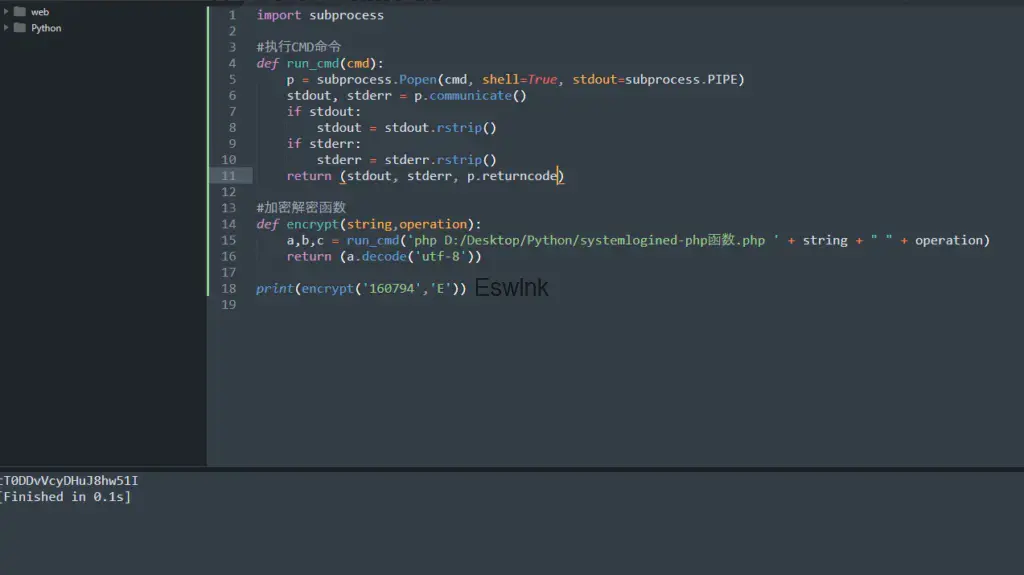 print(encrypt('160794','E'))PHP环境必须在本地安装和环境变量,否则必须将 php绝对路径添加到run_cmd(php)之前。