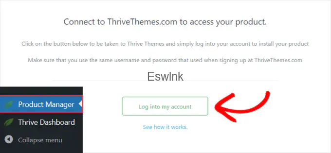 激活后,从 WordPress 管理仪表板转到产品经理选项卡。从这里,只需单击“登录我的帐户”按钮。