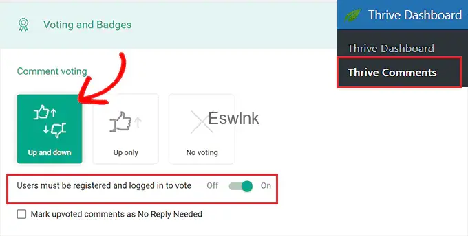 然后,单击“投票和徽章”选项卡将其展开。接下来,您只需选择“评论投票”部分下的“向上和向下”选项。