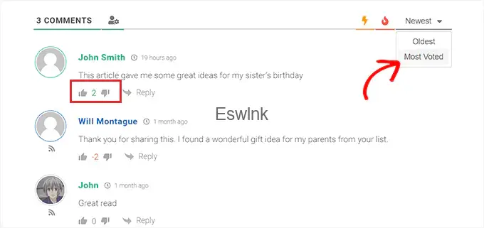 在这里,您会在评论部分的顶部看到一个下拉菜单。用户现在可以从下拉菜单中选择“投票最多”选项,以查看您网站上反应最多的评论。