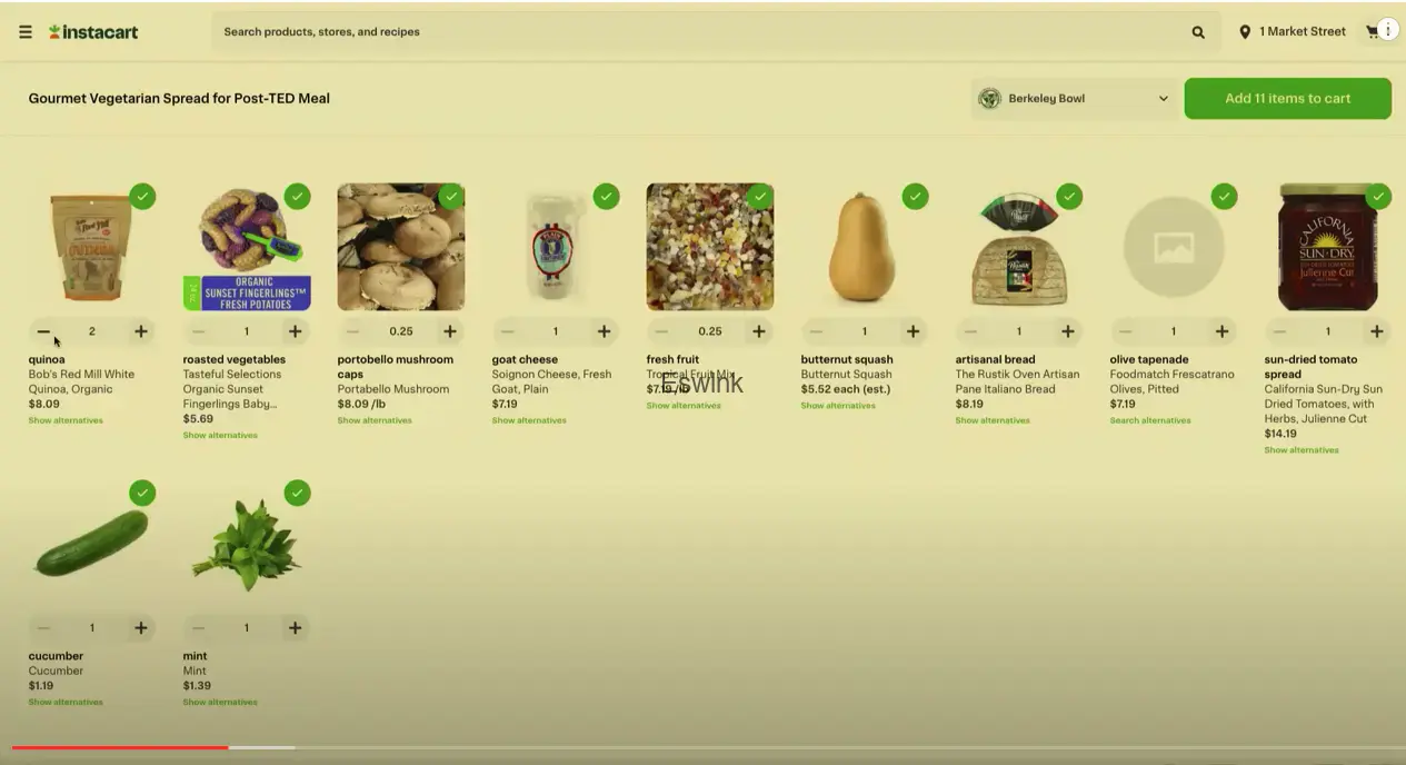 OpenAI 的首席执行官在他最近的 TED 演讲中举了一个很好的例子,说明基于聊天的界面如何不适合对列表项进行操作。首先,他展示了 ChatGPT 可以在 Instacart 上生成购物清单: