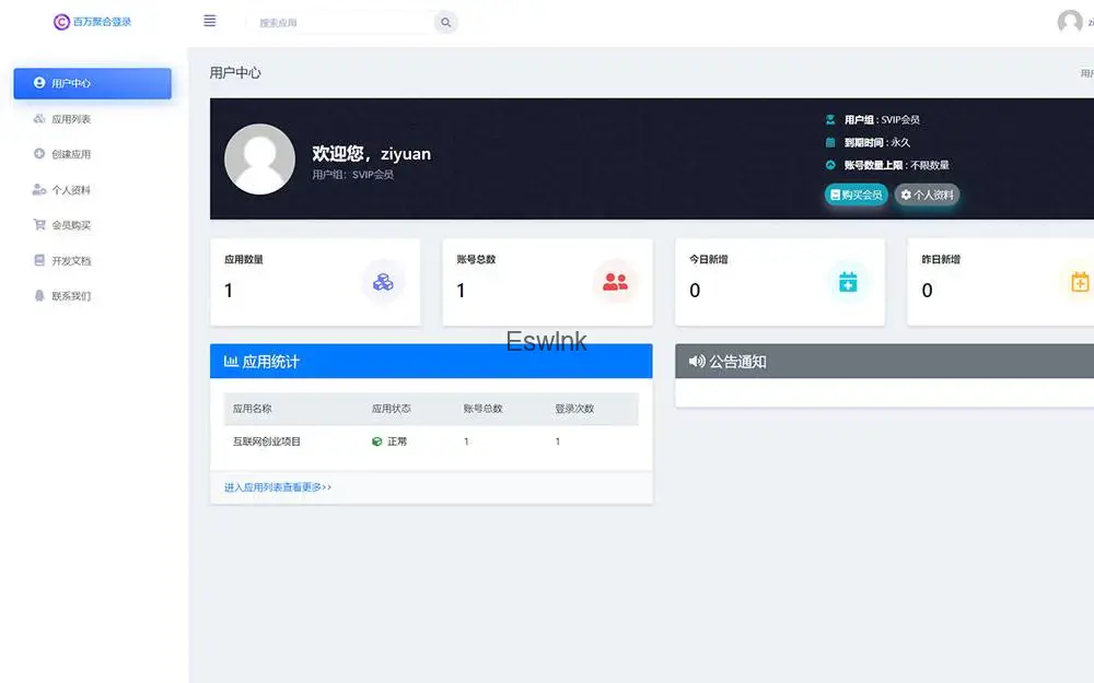 - 全新的用户中心界面,可查看整体统计数据和公告。