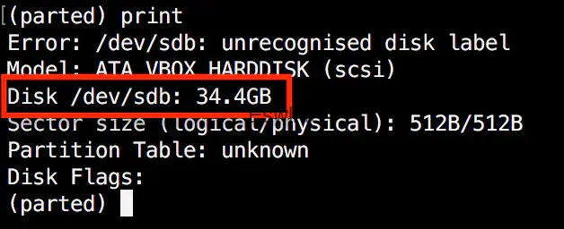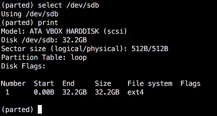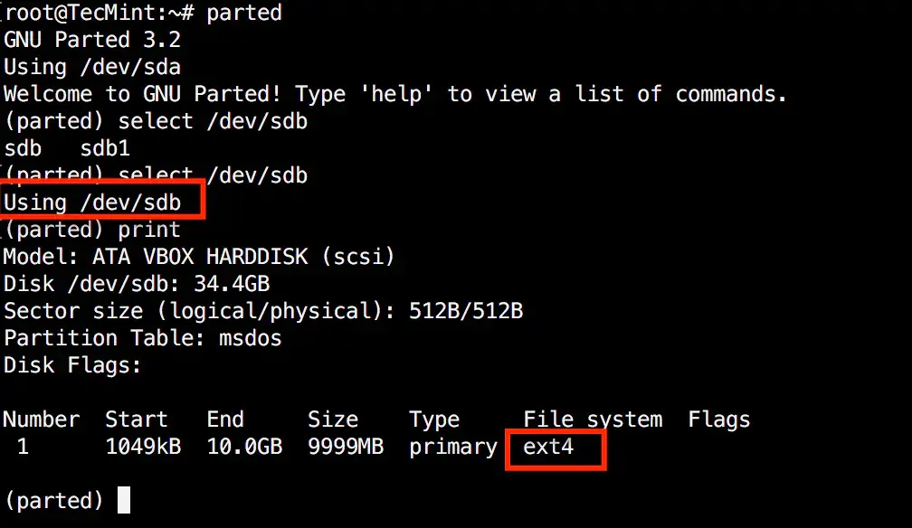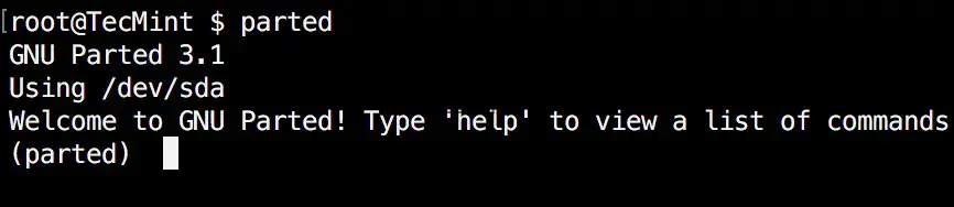 确保安装了parted后,您可以进一步查看本文其余部分中parted命令的一些实际示例。