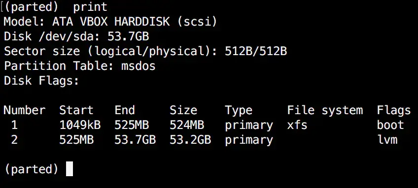 现在parted已经启动,让我们列出所选硬盘的分区。如前所述,parted 默认选择您的第一个驱动器。查看磁盘分区运行情况print。