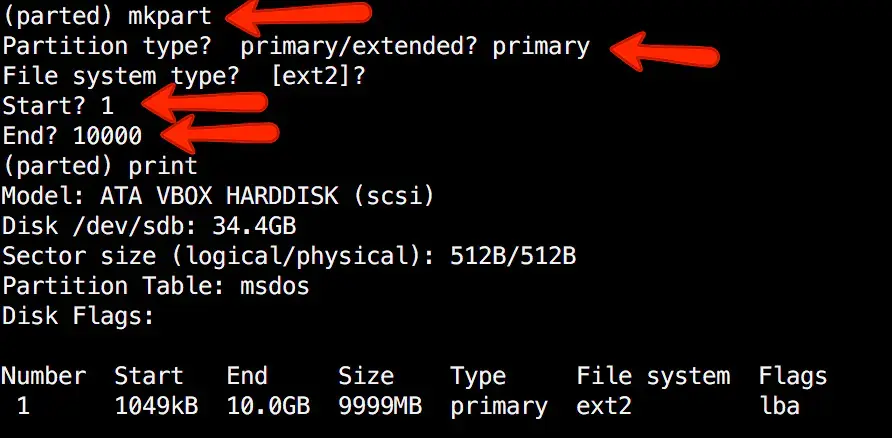 现在使用创建新分区 mkpart。列出的单位为兆字节 ( MB)。我们将创建一个从1到10000的10 GB分区: