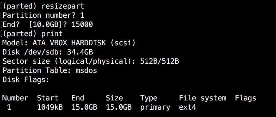 Parted 包含多个有用的函数,其中之一是"resizepart". 您现在可能已经明白了这一点,它"resizepart"可以帮助您调整分区大小。