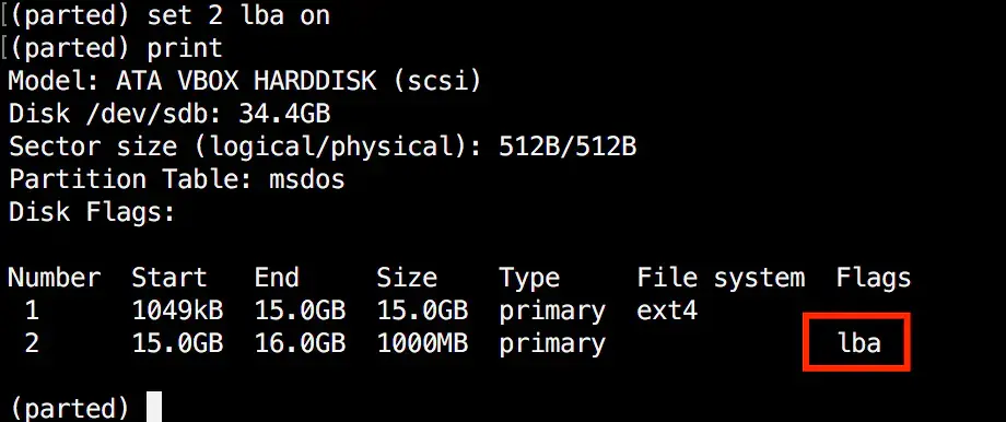 上面的命令将lba第二个分区的标志设置为 on。使用以下命令验证结果print: