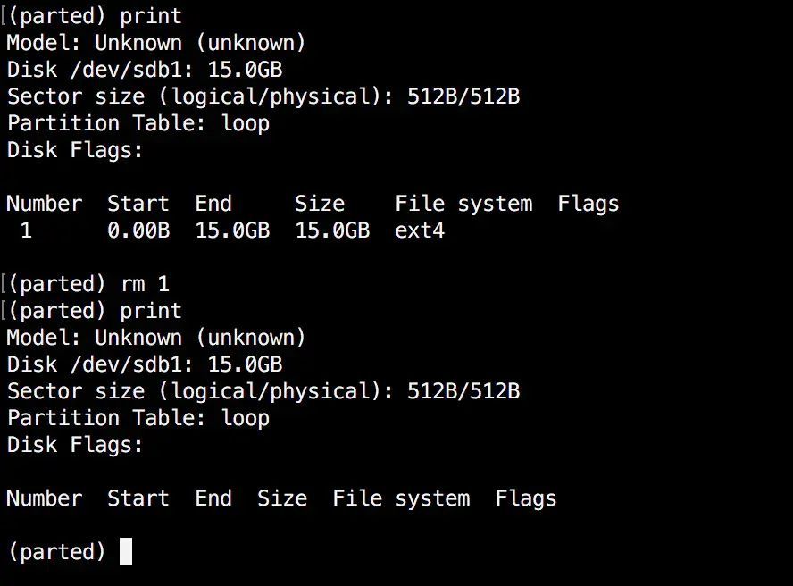 接下来您将学习如何从硬盘驱动器中删除分区。为此,您需要在parted 中使用rm 命令。要删除磁盘分区,您需要知道其编号。
