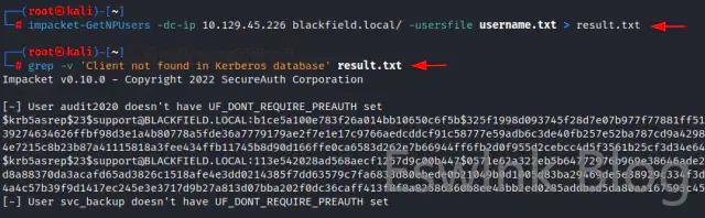 在下面的命令中,我们使用了带有域名的域 IP 地址的 –dc-ip 标志和 -userfile标志来提供潜在用户列表。然后我们使用 grep 实用程序来过滤我们的结果。impacket-GetNPUsers -dc-ip 10.129 。45 。226黑地。local / -usersfile 用户名。txt >结果。TXT