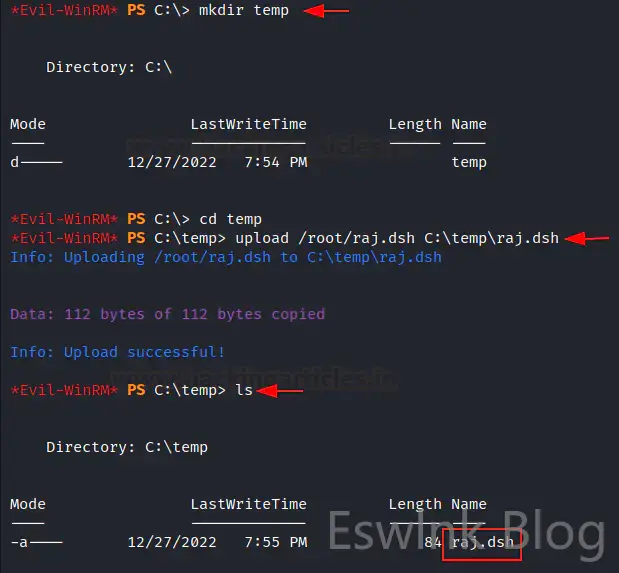 编译后,我们将 raj.dsh 文件传输到我们创建的目标临时目录中。evil-winrm 使我们的工作变得简单,因为它在其中添加了上传功能,这意味着我们不需要在这里以传统方式传输文件。我们确认 raj.dsh 文件已成功上传到 C:\temp 目录中。mkdir 温度光盘温度上传 raj。dsh