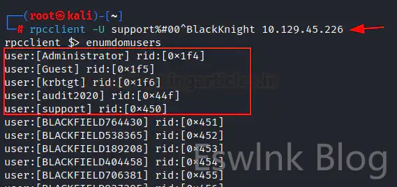 接下来,我们尝试使用获得的凭据登录 RPC 客户端并列出所有 AD 用户,我们注意到三个默认帐户和两个非默认帐户用户。远程过程调用 (RPC) 协议通常用于不同工作站上的进程之间进行通信。然而,RPC 也适用于同一工作站上不同进程之间的通信。rpcclient -U support% #00^BlackKnight 10.129.45.226