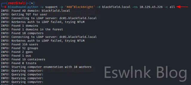 由于我们拥有有效的用户帐户凭据,因此我们决定映射支持用户与其他用户的关系。例如,audit2020 或管理员。为了映射域关系,我们使用了一种名为 bloodhound 的流行工具。Bloodhound 还带有 Kali Linux,如果攻击者拥有活动目录用户的有效凭据,则允许远程映射域。在下面的命令中,我们正在收集我们提供不同标志的所有域信息,用户名(-u),密码(-p),域名(-d),名称服务器(-ns)和收集方法(-C)。bloodhound-python -u support -p ‘#00^BlackKnight’ -d 黑场。本地-ns 10.129 。45 。226 -c 所有