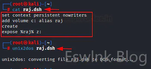 进一步枚举svc_backup用户,发现该用户也是backup operators组的成员。备份操作员组成员有权制作磁盘影子副本并访问系统拥有的所有文件。通过快速搜索,我们得到了另一篇由黑客文章备份提权技术发表的文章。按照博客,我们创建了一个文件,指示磁盘影子将 C: 驱动器的副本创建到 Z: 驱动器中,作为别名 raj 并将其保存为 raj.dsh 文件。DSH 文件扩展名向您的设备指示哪个应用程序可以打开该文件。但是,不同的程序可能对不同类型的数据使用 DSH 文件类型。然后我们把它编译成DOS格式在windows主机上使用。