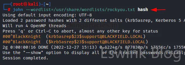 破解密码: #00^BlackKnight约翰 –wordlist=/usr/share/wordlists/rockyou。文本散列