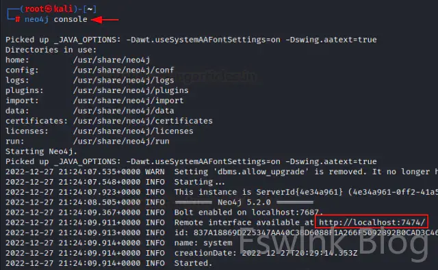 然后,我们启动了 Neo4j 控制台来分析由猎犬收集的文件。该工具为具有集成可视化功能的图形提供了一个交互式控制台。要启动控制台,只需发出以下命令。准备就绪后,我们需要在其默认端口 7474 上访问我们的环回接口。
