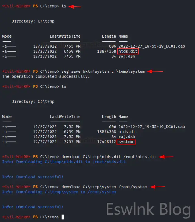 要成功执行此攻击,我们还需要有一个系统配置单元,否则我们将无法从 ntds.dit 文件中提取哈希值。配置单元是注册表中键、子键和值的逻辑组,在操作系统启动或用户登录时将一组支持文件加载到内存中。每次新用户登录到计算机时,为该用户创建一个新的配置单元,并为用户配置文件创建一个单独的文件。因此,我们复制了临时目录中的系统配置单元并将其转移到攻击机器中。reg 保存 hklm\system C:\Temp\systemcd C:\Temp下载 nts。这下载系统