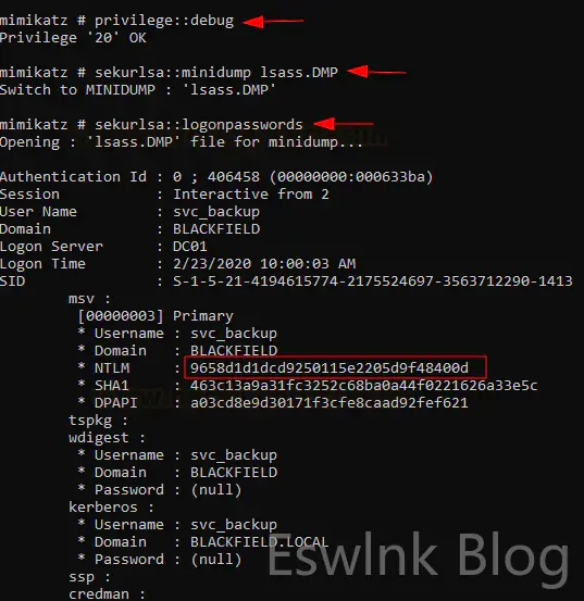 为了从 lsass.DMP 文件中提取数据,我们使用了一个名为 mimikatz 的强大工具。Mimikatz 是黑客和安全专家常用的一种工具,用于从系统内存中提取敏感信息,例如密码和凭据。为此,我们可以在具有系统特权 shell 的 Windows 系统中使用 mimikatz,因为 mimikatz 在低特权 shell 中不起作用。按照以下命令从 lsass.DMP 文件中提取数据。正如预期的那样,mimikatz 从 lsass.DMP 文件中转储了 NTLM 哈希。现在我们可以尝试使用传递哈希技术作为svc_backup用户进行身份验证。黑客文章中有一篇不错的文章,可用于以多种方式利用传递哈希技术。