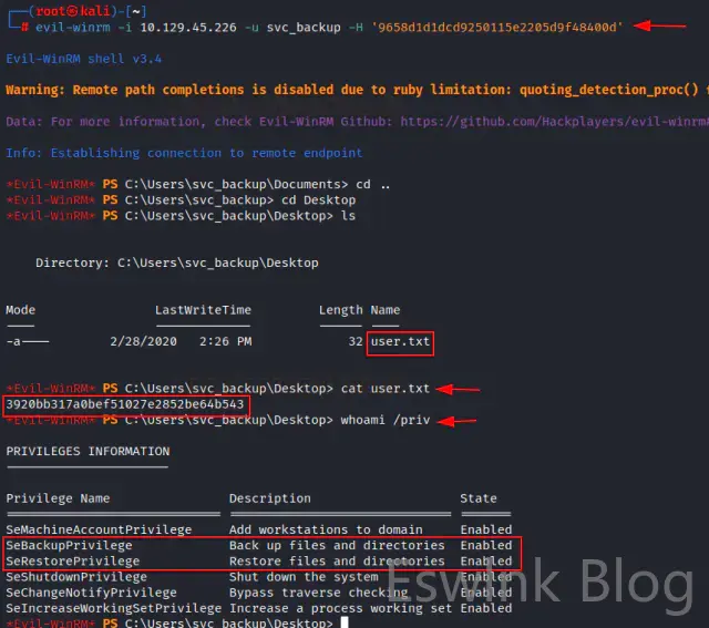使用获得的凭据,我们使用winrm服务以svc_backup用户身份登录,该服务默认在端口 5985 上运行。在 nmap 结果中,我们没有看到这个端口打开,因为 nmap 只扫描 PowerShell 远程端口不计入的前 1000 个端口。我们可以从 svc_backup 桌面目录中获取用户标志。然后我们查看当前用户分配的权限,发现启用了sebackup权限和serestore权限。邪恶的 winrm -i 10.129 。45 。226 -u svc_backup -H ‘9658d1d1dcd9250115e2205d9f48400d’