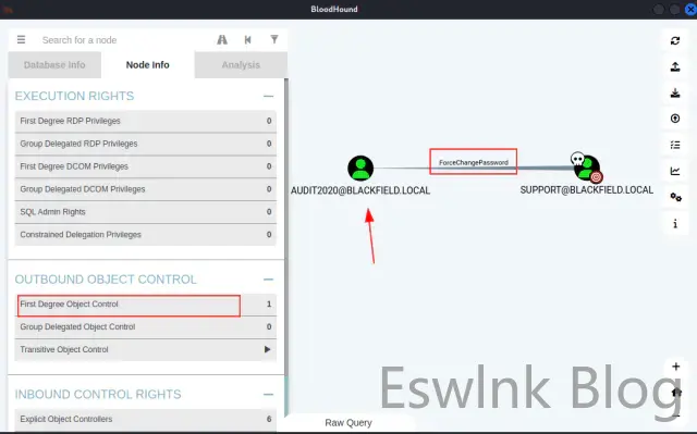 导入文件后,我们将看到具有图形可视化的用户关系。Neo4j 属性图数据库模型包括: 描述域实体(离散对象)的节点。节点可以有零个或多个标签来定义(分类)它们是什么类型的节点。关系描述源节点和目标节点之间的连接。从节点信息选项卡中,我们注意到“一级对象控件”,它显示了支持用户与audit2020的关系,其中支持用户有权更改 audit2020 密码。