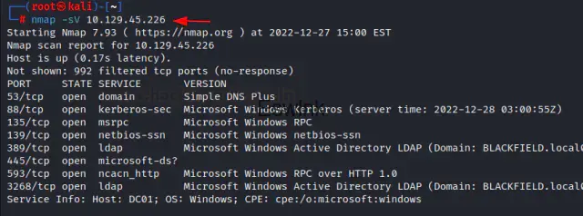 通过 nmap 扫描,我们发现有 8 个端口处于打开状态,其中大部分服务属于 Active Directory 环境。这些服务中的任何一个都可能导致我们遇到任何基于协议的漏洞或任何安全配置错误,这在活动目录环境中很常见。此外,它还将域名显示为BLACKFIELD.local。nmap -sV 10.129 。45 。226