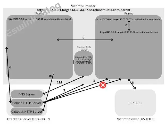 127.0.0.1.target.13.33.33.37.ns.rebindmultia.com. 0 IN A 127.0.0.1然后,受害者浏览器将连接到第一个 IP,并开始与攻击者的第一个恶意 HTTP 服务器进行交互。该服务器将响应一个包含两个 iframe 的页面,一个到/steal,一个到/rebind。iframe/steal将加载恶意页面以进入第二个 iframe 并获取内容。端点/rebind在命中时将发出 302 重定向/并杀死第一个恶意 HTTP 服务器。结果,当浏览器返回到攻击者的 HTTP 服务器时,它将遇到一个关闭的端口。因此,它将回退到第二个 IP. 一旦目标内容加载到第二个 iframe 中,第一个 iframe 就可以进入其中,窃取数据,并将其泄露到攻击者的第二个恶意 HTTP 服务器——回调服务器。