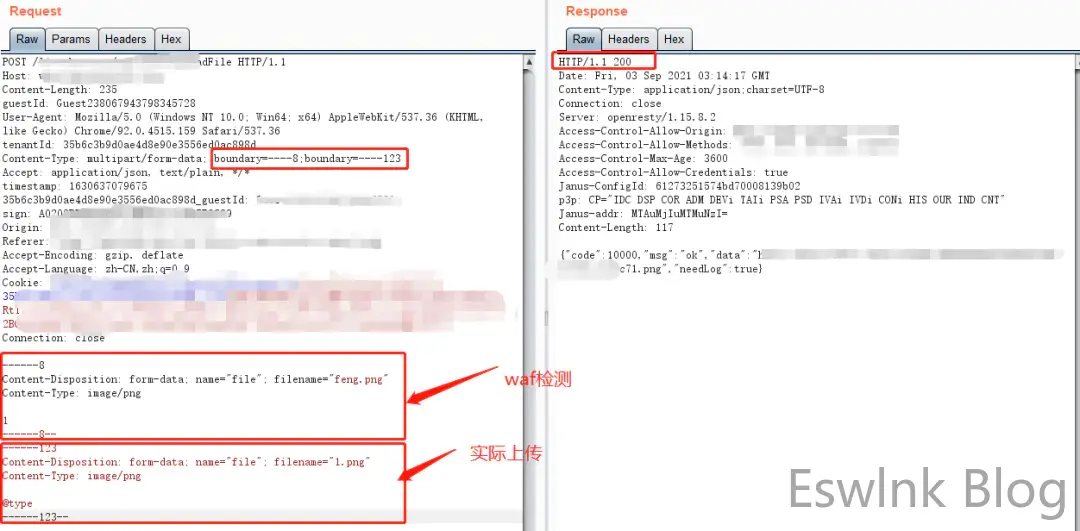 利用 Content-type: multipart/form-date 绕过上传的边界(boundary)限制,通过多 boundary 定义,使 waf 检测范围和实际上传范围不一致,从而绕过 waf 上传恶意内容: