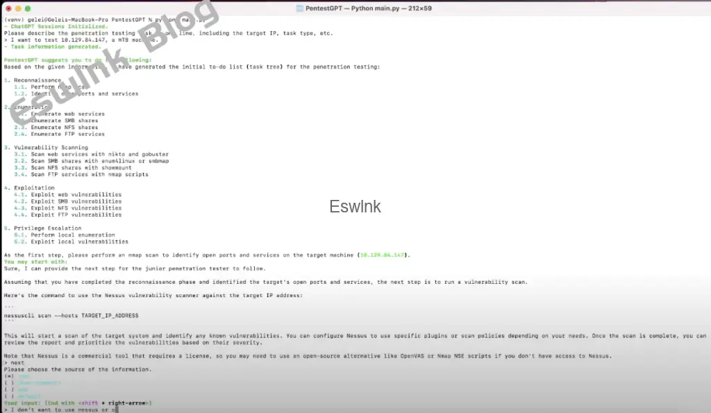 help: 显示帮助信息。next:输入测试执行结果,进入下一步。more: 让 PentestGPT 解释当前步骤的更多细节。此外,将创建一个新的子任务解决器来指导测试人员。todo: 显示待办事项列表。discuss: 与 PentestGPT 讨论。google: 谷歌搜索。此功能仍在开发中。quit:退出工具并将输出保存为日志文件(请参阅下面的报告部分)。