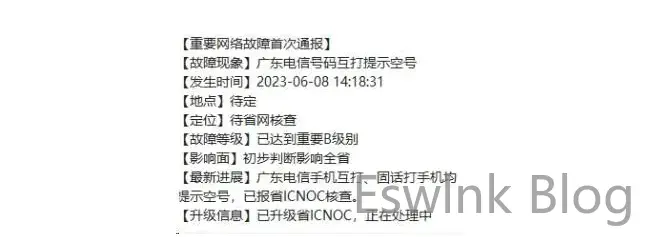 2023年6月8日下午,广东电信突然出现网络崩溃,据部分广东网友反馈,自己的电信手机卡直接显示无信号,无法拨打电话、收发短信、上网,或者拨打电话时提示空号或关机,手机重启也无济于事。其他省份暂时未出现此问题。截止本文发布为止,已经恢复。
