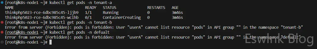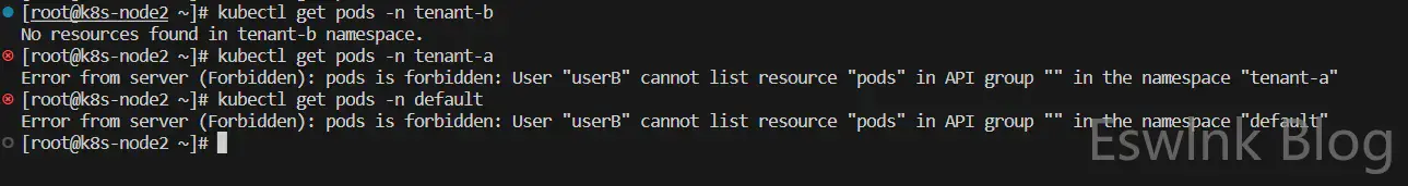 rolebinding.rbac.authorization.k8s.io/tenantb-pod-all-permission-role-binding created最后:我们来验证一下两个用户是否只能在当前租户空间(namespace)中操作Pod容器。如下图所示,k8s-node1使用userA作为用户账户,k8s-node2使用userB作为用户账户,它们仅能操作自身所在的namespace,除此之外无法访问任何namespace