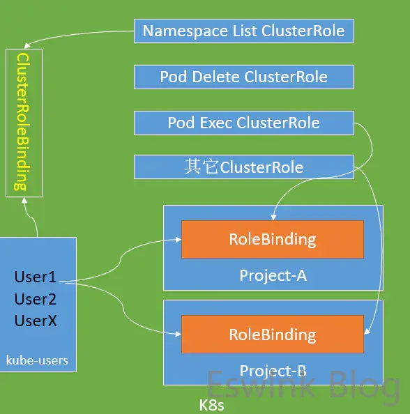 假设一个场景,当User Account A需要拥有所有Pod的可读权限,那么管理员(kubernetes admin)就通过RoleBinding的形式将Pod-read-Rule绑定给User Account A;当User Account A再想要要所有Pod的可写权限时,以相同的RoleBinding方式将Pod-Write-Rule绑定给User Account A即可。