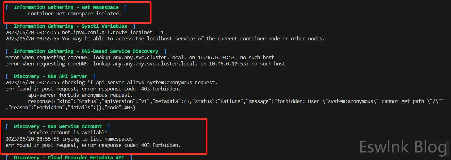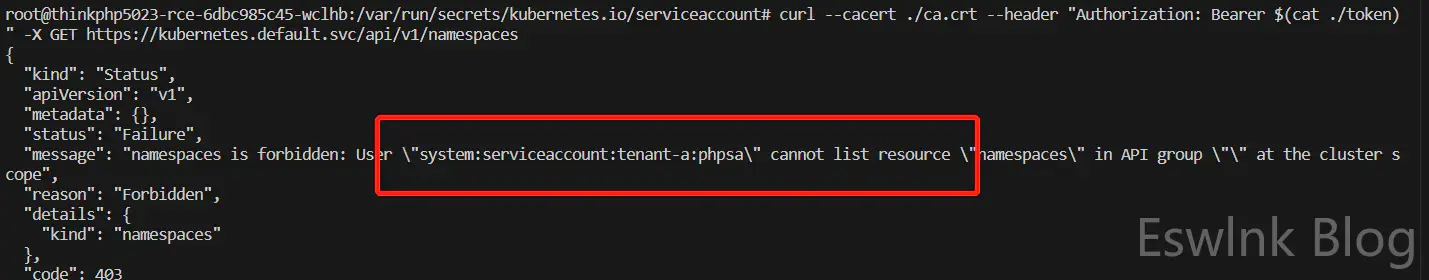 对于第一个问题,笔者暂时没有找到很好的解决方案。而第二个问题有一种取巧的解决方法:当我们尝试去访问api server中任何越权的操作端点时,api server会返回serviceaccount:x:y cannot list resource错误,此时x代表当前SA账户所在的namespace,y就代表当前SA账户的用户名