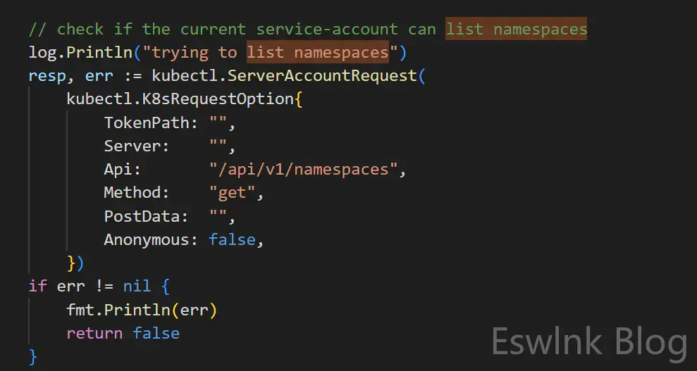 但cdk做的事情比较有限,如下图cdk代码段所示,它通过访问api/v1/namespaces端点来断言自己是否拥有list namespaces权限,但却没有甄别当前SA账户处于哪个namespace下。